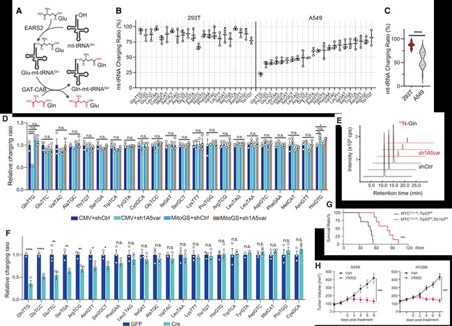 (A)线粒体谷氨酰胺tRNA氨酰化过程模式图。(B-C)293T和A549细胞的线粒体tRNA charging定量结果。(D)对照组与SLC1A5var敲低组以及回补线粒体定位谷氨酰胺合成酶组的A549细胞的线粒体tRNA charging定量结果。(E)对照组与SLC1A5var敲低组mt-tRNAGln来源15N-Gln的离子色谱图。(F)对照组(GFP)与Slc1a5敲除组(Cre)小鼠的线粒体tRNA charging定量结果。(G)对照组(MYCLSL/LSL;Trp53fl/fl)与Slc1a5敲除组(MYCLSL/LSL;Trp53fl/fl;Slc1a5fl/fl)肝癌模型小鼠的生存曲线图。(H)对照组(Veh)与MGI抑制组(V9302)的裸鼠异种移植瘤体积变化。