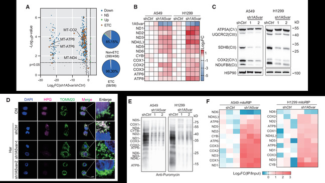 (A)火山图和饼图显示对照组与SLC1A5var敲低组A549细胞的线粒体蛋白及ETC蛋白水平变化。(B)对照组与SLC1A5var敲低组细胞线粒体自主编码蛋白的转录水平变化。(C)对照组与SLC1A5var敲低组细胞线粒体蛋白水平变化。(D)对照组与SLC1A5var敲低组细胞点击化学处理后的HPG免疫荧光染色。(E)对照组与SLC1A5var敲低组细胞的线粒体蛋白puromycin掺入标记。(F)对照组与SLC1A5var敲低组细胞的线粒体核糖体免疫共沉淀分析。
