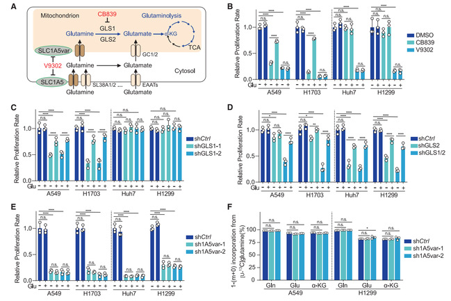 (A)细胞中谷氨酰胺区室化转运的分解代谢模式图。(B)对照组(DMSO)和处理组(CB839,V9302)细胞在有无外源谷氨酸添加情况下的细胞生长统计。(C-E)对照组(shCtrl)和对应基因敲低组在有无外源谷氨酸添加情况下的细胞生长统计。(F)对照组和SLC1A5var敲低组(sh1A5var)细胞在[U-13C]谷氨酰标记后衍生的13C代谢物标记百分比。