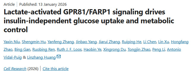 2026年1月13日,复旦大学代谢与整合生物学研究院黄林章课题组在国际知名期刊Cell Research上发表了题为“Lactate-activated GPR81/FARP1 signaling drives insulin-independent glucose uptake and metabolic control”的研究论文。该研究发现乳酸通过GPR81-FARP1-GLUT4信号轴增加肌肉葡萄糖摄取,调控机体葡萄糖稳态,提出“乳酸信号调控血糖”的新策略。