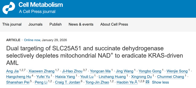 2026年1月29日,复旦大学代谢与整合生物学研究院叶浩彬课题组在Cell Metabolism上发表了题为“Dual Targeting of SLC25A51 and Succinate Dehydrogenase Selectively Depletes Mitochondrial NAD+ to Eradicate KRAS-Driven AML”的研究论文。该研究提出通过双重靶向线粒体NAD+转运蛋白SLC25A51和琥珀酸脱氢酶(SDH),选择性耗竭线粒体NAD+,从而根除KRAS驱动的急性髓系白血病,为基于代谢脆弱性的治疗提供了新范式。
