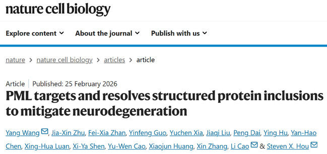 2026年2月25日,复旦大学生命科学学院/代谢与整合生物学研究院侯宪玉教授及其合作团队在Nature Cell Biology在线发表题为“PML targets and resolves structured protein inclusions to mitigate neurodegeneration”的研究论文。该研究以神经元核内包涵体病(NIID)中的多聚甘氨酸(polyG)包涵体为对象,发现其通过募集天然无序蛋白形成分层、不可移动的凝聚体,从而破坏核内蛋白质质量控制和DNA损伤修复。