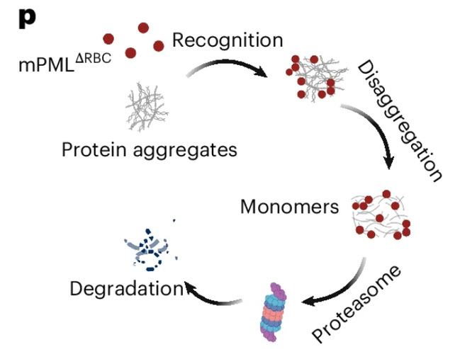 利用其有序、分步的组装特性,作者鉴定出早幼粒细胞白血病蛋白(PML)为关键因子,其可通过伴侣蛋白介导的解聚作用和蛋白酶体依赖性降解途径,主动识别并清除polyG包涵体。工程化PML变体能够选择性清除包括polyG、polyGA、polyQ、TDP-43及SOD1在内的细胞核与细胞质聚集物。系统性递送PML可缓解NIID及TDP-43蛋白病小鼠模型的认知与运动功能缺陷。这些发现揭示了核内包涵体在空间组织上的保守性,并确立了PML作为治疗蛋白质聚集相关神经退行性疾病的潜在效应分子。