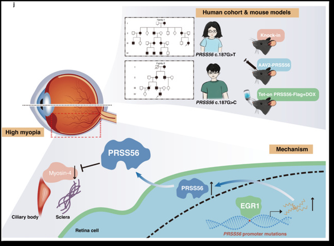 已有报道PRSS56基因编码区丧失功能性突变导致小眼畸形并伴发远视【4】,本研究提出“表达增益型”模式对阐述PRSS56在眼球发育中的角色提供反向支撑,并解析PRSS56作为一个丝氨酸胰蛋白酶在眼球发育调控中的催化底物。根据动物模型数据,团队发现即使错过视力发育的关键窗口期,PRSS56高表达依然可以实现巩膜重塑来调控眼轴的伸长,体现其在近视防控和靶点开发中的转化潜力,为儿童与青少年高度近视的精准干预开辟新方向。