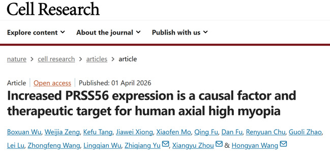 2026年4月1日,复旦大学附属妇产科医院/代谢与整合生物学研究院王红艳教授、复旦大学附属妇产科医院周翔宇研究员与复旦大学附属眼耳鼻喉医院于志强主任联合在Cell Research发表名为“Increased PRSS56 expression is a causal factor and therapeutic target for human axial high myopia”的研究论文,揭示PRSS56基因非编码区突变作为独立风险因子导致轴性高度近视的分子机理,并发现PRSS56高表达是近视发生的潜在生物标记物;基于PRSS56的光响应特性,团队在动物模型中开发蓝光照射干预策略,为户外暴露利于青少年近视防控提供相关的理论支撑。